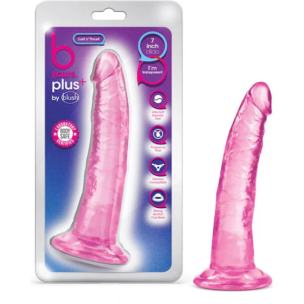 Blush B Yours Plus Lust n' Thrust is a realistic dildo with a slight curve for G-spot and P-spot stimulation, and a sturdy suction cup base that holds to any smooth flat surface for solo time. Or partner up for strap-on harness...