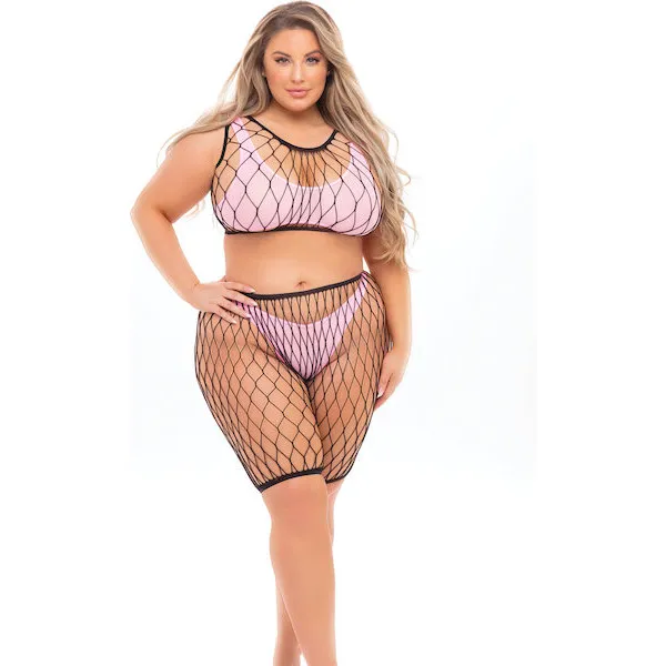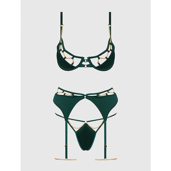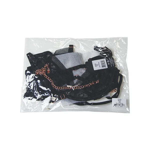 Iridescent foiled mesh halter bralette with removable pearl draped underbust and crotchless panty with dangling pearl detail. Materials: 87% Nylon, 13% Spandex Washing Instructions: Hand wash separately in cold water. Do not...