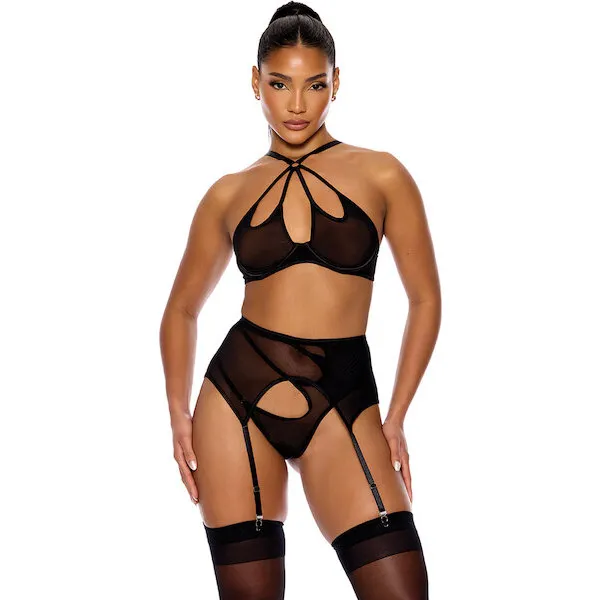 Are your ready for a sensual silhouette that guarantees an unforgettable experience? This three-piece eyelash lace set includes a bold top with underwire and underboob cutouts, adjustable straps, plus a matching garter belt and...