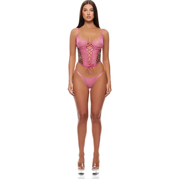 Dare to sizzle in the Felicia Bra, Garter, ang G-string Set. This trio features a racy dance of leopard mesh and lace for a touch of romance. The halter bra seduces with a revealing lattice-like cutout, while the garter belt...
