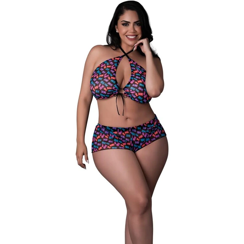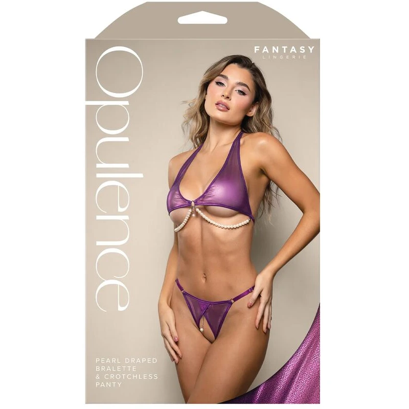 Opulence Shimmer Mesh Halter Top & Panty w/Pearl Details - Purple S/M