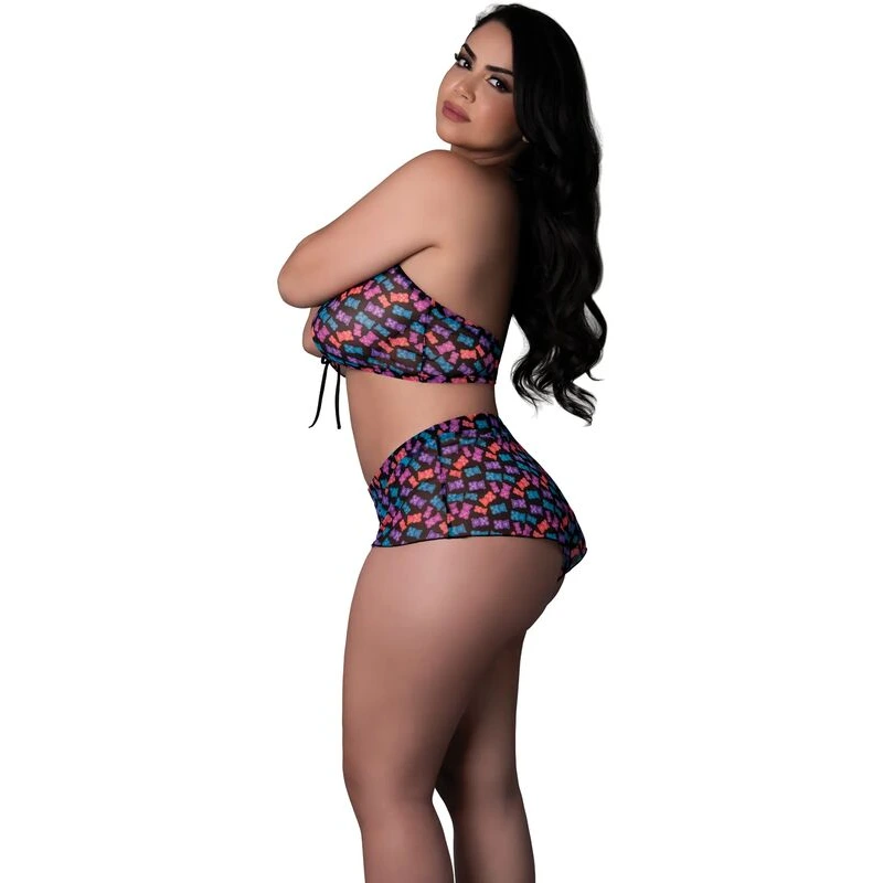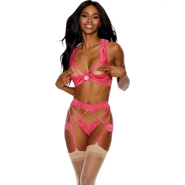 Forever Yours 2-Piece Bustier Short Set. Lace heart embroidered & swiss dot illusion tulle. Bustier: - Satin ribbon bow detail - Demi cup with underwire - Adjustable garter straps - Hook & eye closure Thong: - Satin ribbon bow det...