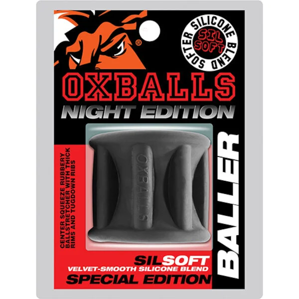 OXBALLS BALLER rib-stretchNIGHT EDITIONmax-tall ballstretcher in our lush rubbery SILSOFT SILICONE blend and a smooth, velvet-black color. This is a softer, squishier formula for the hardest and darkest of play. BALLER soft...