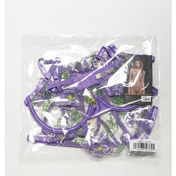 Orchid Blossom 2-Piece Set. Embroidered orchid detail on illusion tulle. Plunge bralette cup. Oversized hardware detail. Thong back. Cotton gusset. Medium: Cup- B-C. Bust - 34-37 inches. Waist - 25-28 inches. Hips - 36-39 inches.