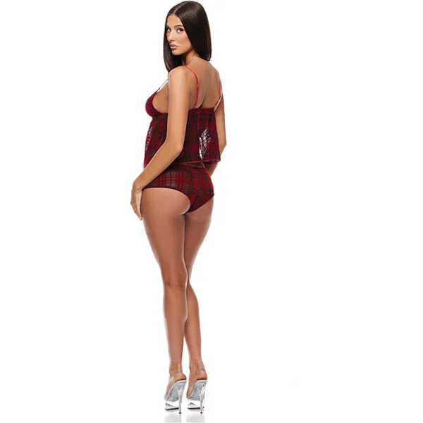 This 2-piece plaid burnout velvet mesh set includes a babydoll cami and matching boyshorts, all done in our maximum stretch fabrication. The cami features a mini bow centerpiece and picot elastic trim, while the low-rise boyshorts...